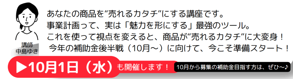 加えて、事業計画書を作成すると、補助金申請にも即使えるので一石二鳥なのですね(*´艸`*) 今年度後半戦は、10月から申請開始されるものが多いので、今から準備すれば間に合うそうです~!