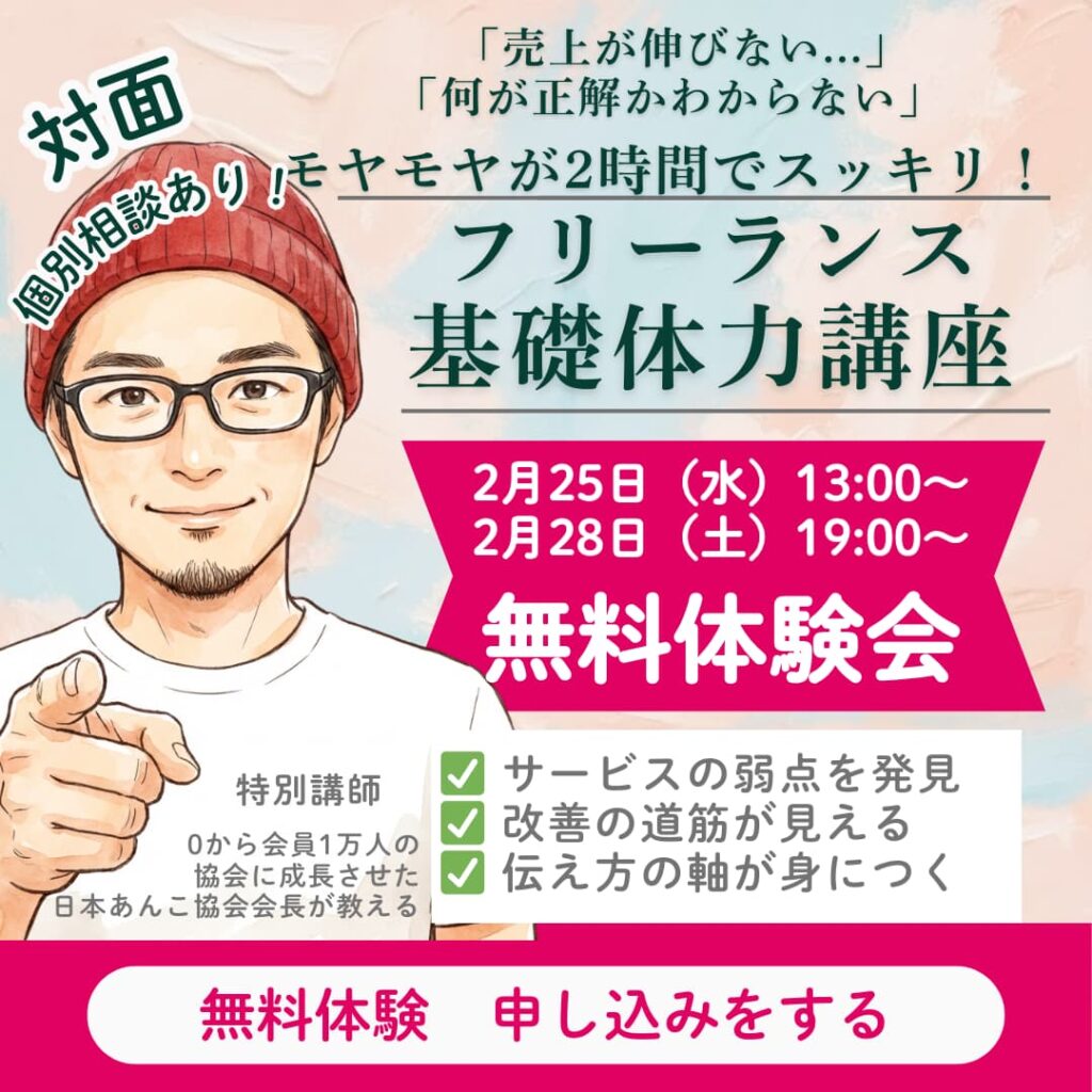 ・フリーランス準備中の方 ・フリーランスをスタートしたばかりの方 ・フリーランス1年目以降で売上に悩んでいる方 |